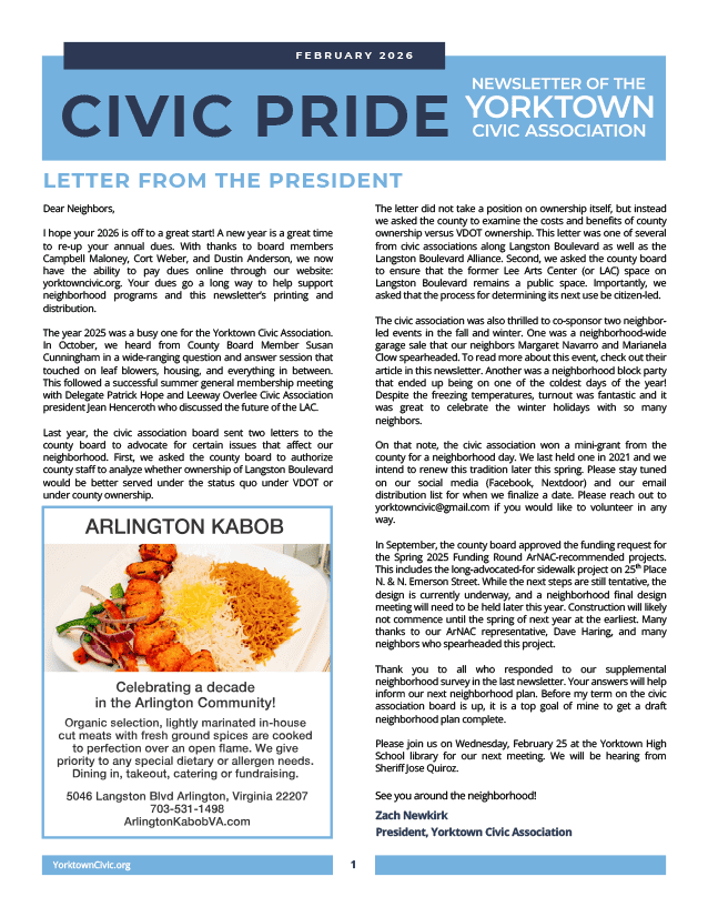 The Yorktown Civic Association is the county-recognized neighborhood association representing the residents of the Yorktown neighborhood of Arlington, Virginia. Our neighborhood consists of over 1000 homes, one of the Washington, D.C. area’s top public high schools, convenient shopping and wonderful parks.